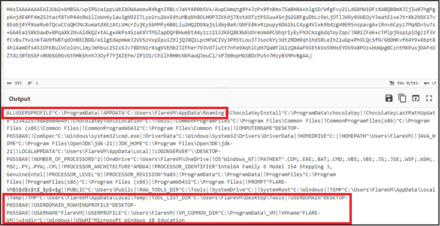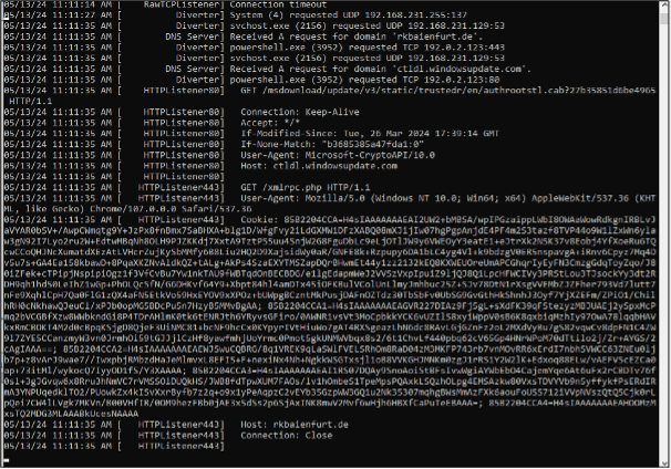 MDR conducted network and C2 examinations using Wireshark and FakeNet to perform a network capture during the execution of Are_bengal_cats_legal_in_australia_72495.js. FakeNet showed various domain names being reached out to with GET /xmlrpc.php HTTP/1.1 requests via Powershell.exe. The requests contained Base64-encoded cookies which, when decoded, showed enumeration information regarding device directories and host information such as the folder path of C:\Users\<Username>\AppData\Roaming\ , as shown in Figure 13. As shown below, the process would read USERNAME and USER DOMAIN information and send the data to the URIs.