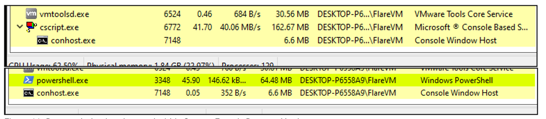 Shortly after Wscript.exe executed Are_bengal_cats_legal_in_australia_72495.js, Process Hacker showed CScript.exe and Powershell.exe being created with a conhost.exe spawned, as shown in Figure 11. MDR observed that Wscript.exe would terminate, followed by Cscript.exe that would also terminate shortly after, after which Powershell.exe was created.
